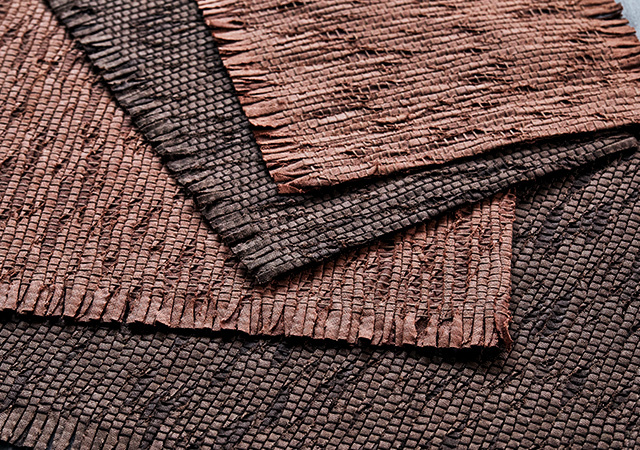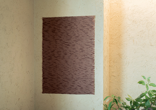 在編織過程中,由於無法控制裂線的捲曲,將呈現出意料之外的色彩變化,這也是裂織的一大魅力。由於表面和背面的色彩差異而看起來像是隨機圖案的裂織,每個部分都是獨一無二的,是透過自然變化所誕生的特別布料。