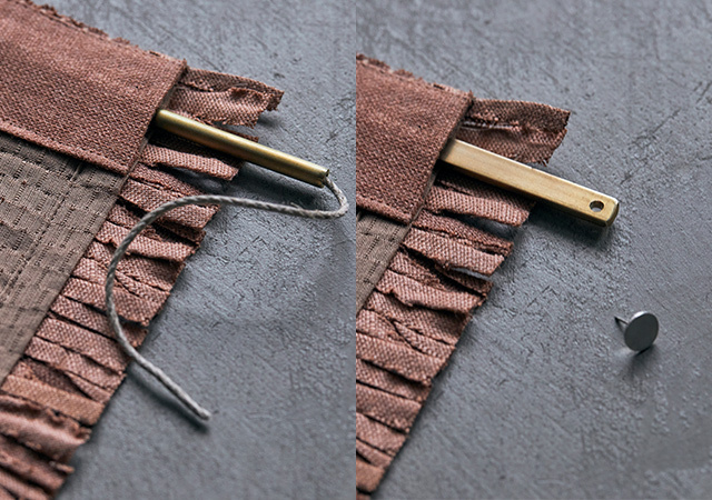 本產品附有黃銅桿和繩子,可供掛毯裝飾使用。如果想使用繩子懸掛,請按左側圖片的方式,將繩子穿過圓桿後使用。如果想要直接釘在牆上,可以使用平桿。