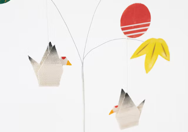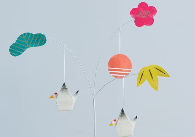 迎春擺飾使用手織麻製成,描繪了一對翱翔於元旦空中的夫婦鶴,象徵團圓、長壽。同時點綴著喜慶的松、竹、梅,營造出充滿新年祝福的氛圍。