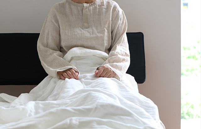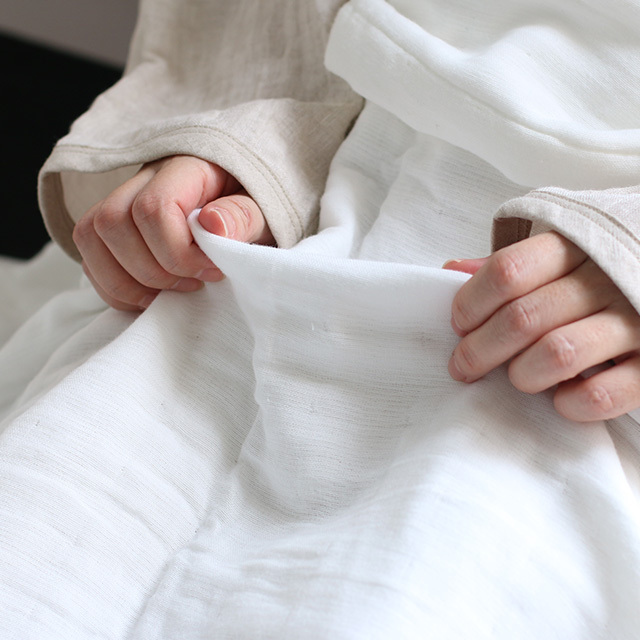 「雪音」,如同踩在輕盈乾爽的粉雪上,觸感紮實而舒適。這款棉紗毯擁有卓越的吸水速乾性,能迅速吸收睡眠中散發的汗水,並快速乾燥,保持肌膚乾爽;觸感柔和,即使是敏感肌或嬰兒也能安心依偎。 因為是每日相伴的寢具,我們堅持選用對肌膚溫和舒適的材質。