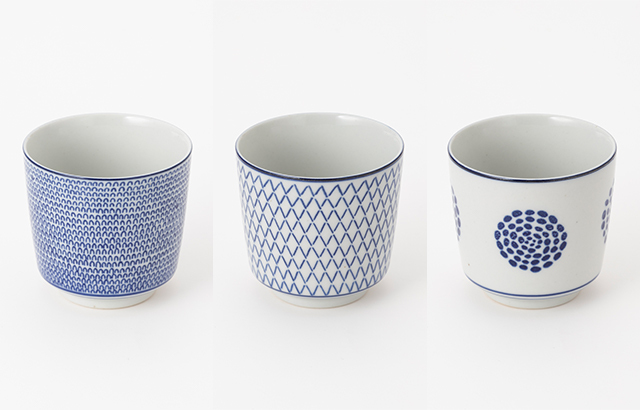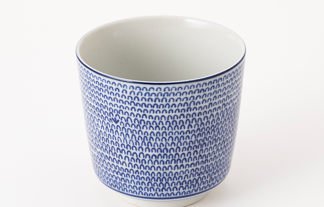 印判是一種在燒製前利用印章、模具或轉印紙在器皿上轉印圖案的技法。這項技術大幅縮短了上色時間,使得曾為高級品的有田染付瓷器也能進入平民家庭。即使是轉印,每件作品都會顯現出滲色和微暈染效果,展現獨特風味。這些印判瓷器上繪有三種吉祥圖案:象徵子孫繁榮和長壽的「微塵唐草」、招福的「網目」,以及象徵長壽的「菊花」。