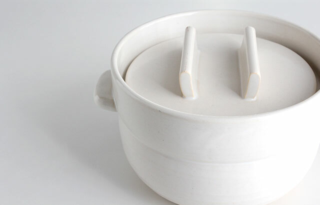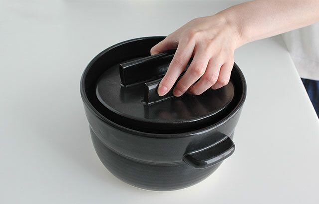 kamoshika道具店的陶器是使用三重縣四日市市的傳統工藝「萬古燒」製作,這種陶土富含能增強耐熱和耐久性的「葉長石」。尤其是這款飯鍋所用的陶土,經過廠商精心調配葉長石的含量,以充分發揮其特性。這樣的設計能防止長期使用後容易出現的「裂紋」等破損。此外,由於釉藥也混合了「葉長石」,因此能使用瓦斯爐直火加熱。