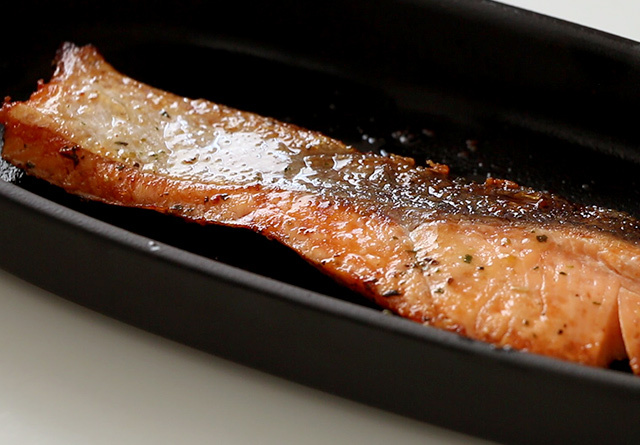 在預熱過的烤盤上刷一層油、放上魚肉,熱度瞬間竄升,滋滋作響。