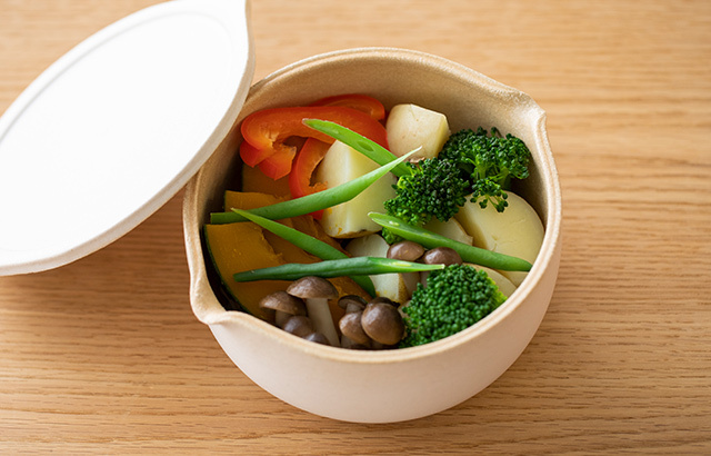 ※請將器皿和蓋子浸泡在水中1分鐘,輕輕擦拭外側水分後放入蔬菜微波加熱。
