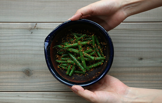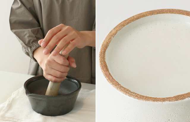 由於外觀足夠美觀,也能作為器皿,將磨碎的芝麻與食材拌勻後將餐點直接端上餐桌,看起來也有模有樣。由於是片口的研磨鉢,還可以裝入自製的醬料,或是用來補充火鍋中的高湯,活用在各種情境。
