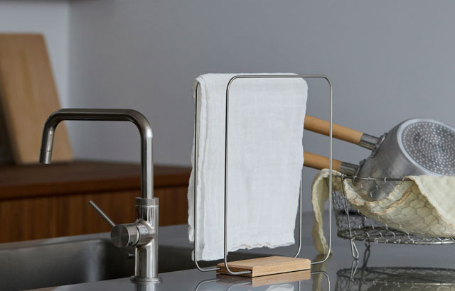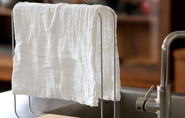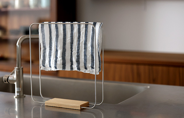這款掛架採用雙線設計,您可以分別掛上兩條摺疊起來的花方巾,或兩條攤開的蚊帳織方巾(30×40cm)。也能依用途,將廚房用與餐具用的方巾分開懸掛在兩根線材上,讓衛生更有保障。